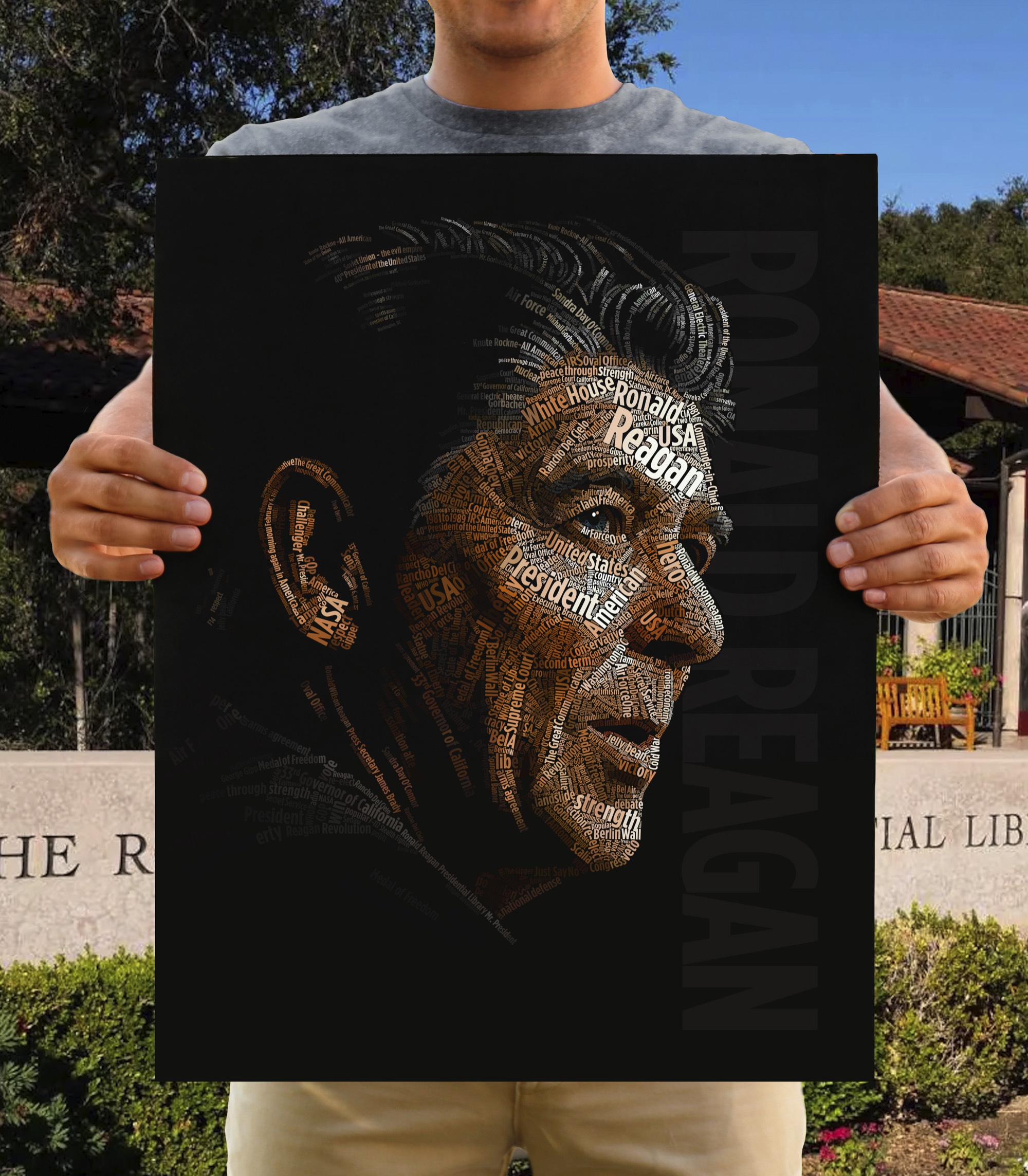 I have taken the liberty and invested the time to create a sample style that uses words from President Reagan’s life to build layers of a portrait. It is my hope the sample might spark some ideas or fit any needs the Ronald Reagan Foundation might have in sharing its message with the world.