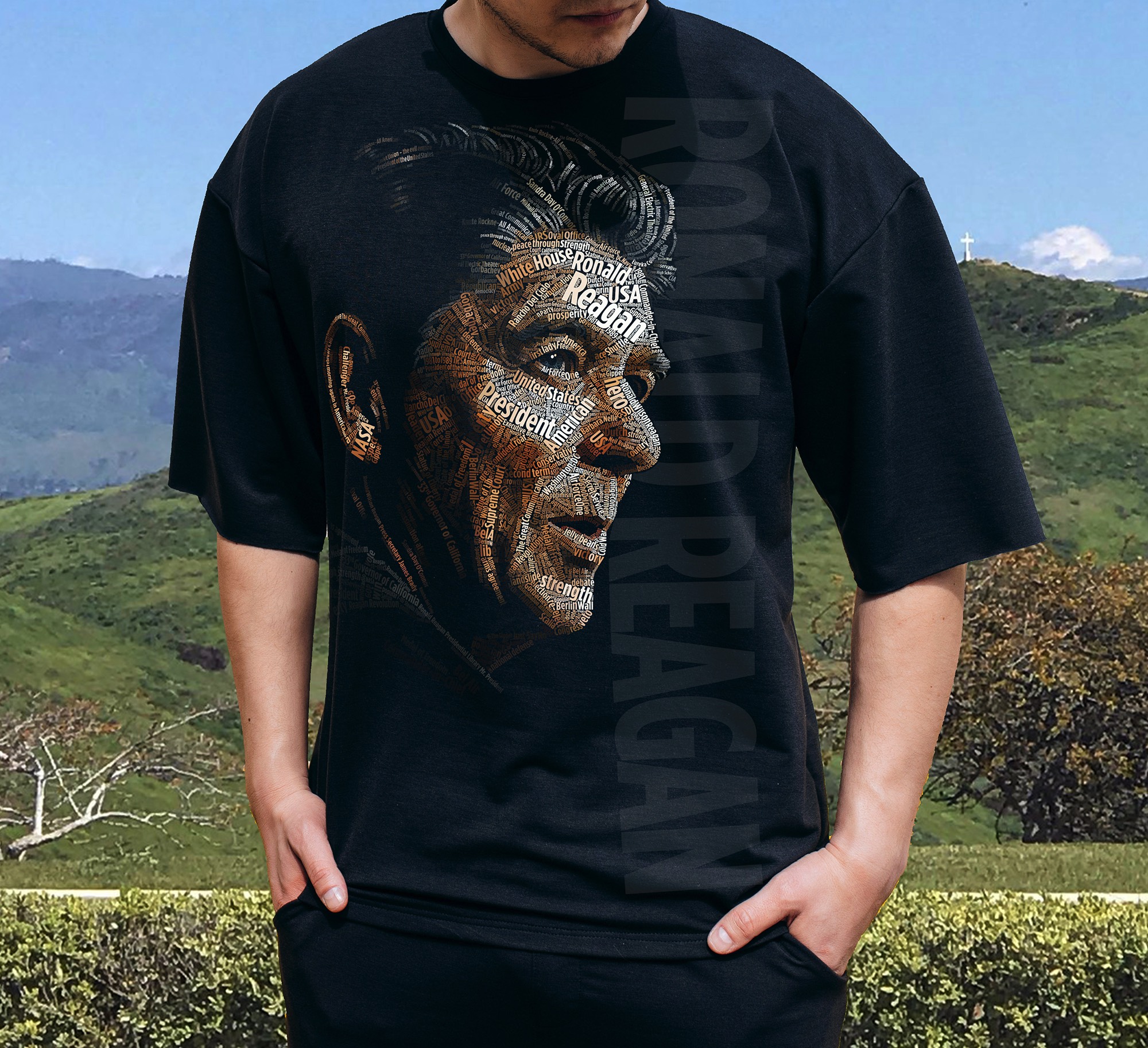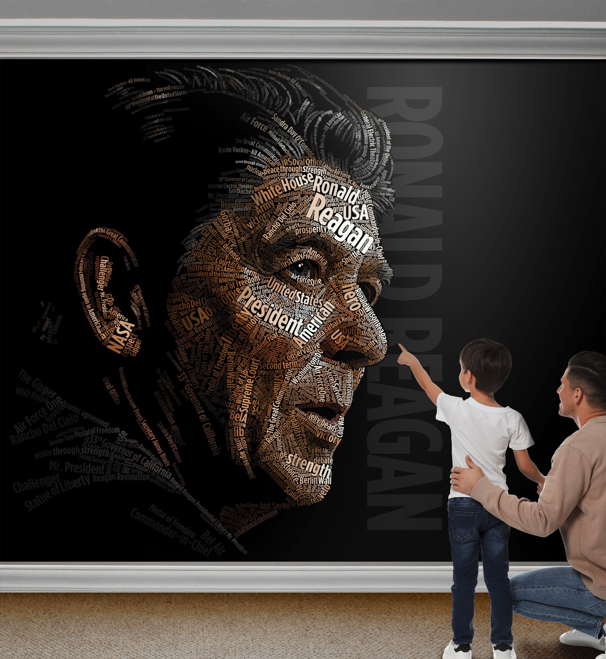 I have taken the liberty and invested the time to create a sample style that uses words from President Reagan’s life to build layers of a portrait. It is my hope the sample might spark some ideas or fit any needs the Ronald Reagan Foundation might have in sharing its message with the world.